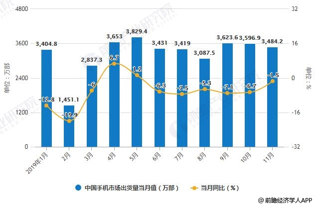 中国信通院数据显示,2019年11月,国内手机市场总体出货量为3484.2万部,同比下降1.5%。其中,5G手机出货量达507.4万部,相较于10月份的249.4万部环比增长103.45%。
