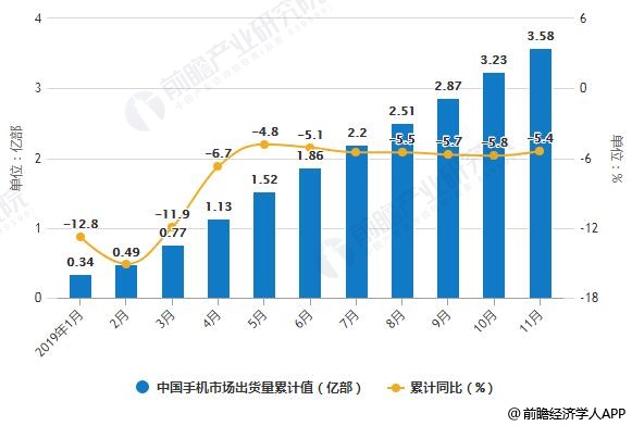 累计方面,2019年1-11月,国内手机市场总体出货量为3.58亿部,同比下降5.4%。其中,4G手机3.35亿部,5G手机835.5万部。