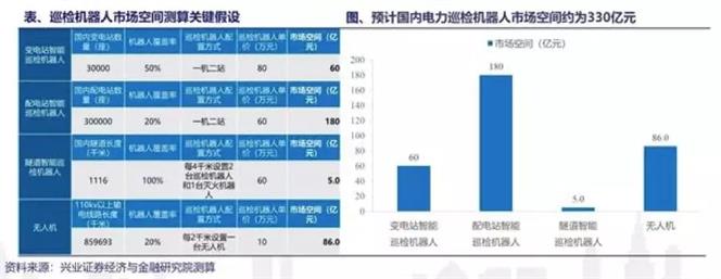 据兴业证券测算,预计国内电力巡检机器人市场空间约为330亿元,其中配电站巡检机器人市场空间为180亿元,变电站巡检机器人市场空间为60亿元,无人机市场空间为86亿元,隧道巡检机器人市场空间为5亿元。