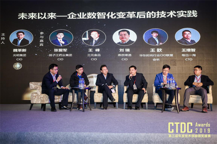 上午下半场是围绕“未来已来——智慧零售企业背后的数智和技术实践”展开的圆桌对话,参与对话的有:扬子江药业CIO张爱军、三元食品CIO王峰、燕京啤酒CIO刘瑞、华东时尚行业CIO联盟会长王歆、每日一淘CTO王增智 。由光明集团CIO魏革新主持。针对数字化转型过程中本企业,或本行业碰到的痛点各自发表自己独到的看法与建议。