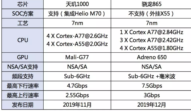 两者最大的不同是,天玑1000采用的是5G SoC方案,而骁龙865依然采用了外挂基带的方式。且此次外挂方式与过去骁龙855外挂X50不同,骁龙865把4G基带芯片也从SoC里移除了,并将之与5G基带一起封装于X55,这意味着骁龙865和X55是搭配销售的。