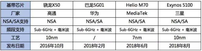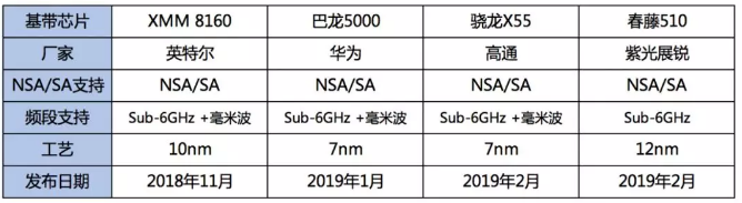 早在2019年2月之前,如上表,高通、华为、MediaTek、英特尔、三星和紫光展锐六大芯片巨头相继发布了5G基带芯片。在这场竞赛中,工艺制程从10nm发展到7nm,支持的网络能力从仅支持NSA发展到支持NSA/SA双模,芯片的集成度、性能、能效和连接能力越来越强。直到2019年4月英特尔宣布正式退出5G智能手机调制解调器业务后,5G手机芯片基本形成了五强争霸之势。