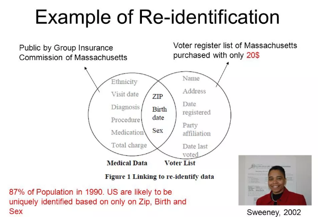 在基于美国选举人公共注册信息的基础上,87%的美国人基于邮编、性别、出生日期即有可能被识别出个人身份;