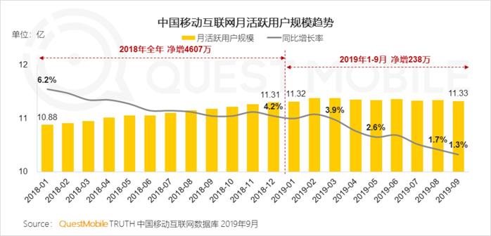 根据Quest mobile《2019年中国移动互联网秋季大报告》,中国移动互联网月活跃用户规模9月已达到11.33亿,截止到9月全年只增长了238万,增长率只有可怜的1.3%,而去年这个数字是4607万,2019是人口红利真正走到尽头的一年;