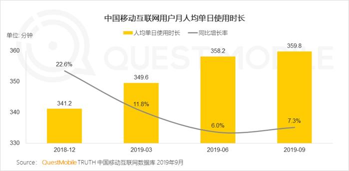 除了用户数,增速停滞的还有用户时长,中国移动互联网月人均单日使用时长的增速从2018年12月的22.6%下降到了2019年9月的7.3%,国民总时间高速增长的时代结束了,竞争变成存量博弈;