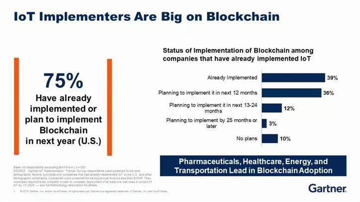 Gartner通过对500多家美国公司的调研之后发现,物联网+区块链比预想中的发展速度快得多,有75%的公司已经采用或计划在2020年底采用区块链。