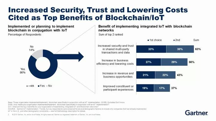 在接受调查的受访者中,有63%的人认为他们的物联网+区块链项目将提升多方共享交易和数据的安全性和可信度。43%的人认为物联网+区块链将增加收入和创造商机。