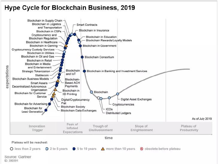 而在不久之前,Gartner刚刚发布了区块链在2019年的技术演进周期,区块链在各行各业的应用,有波峰也有波谷。