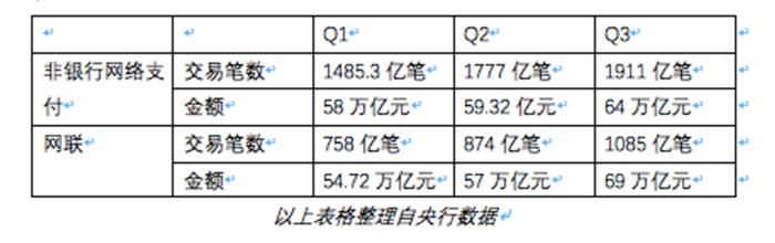 根据央行支付结算司数据,2019年Q1-Q3,非银行体系的网络支付(为网联+第三方余额支付-红包-支付账户余额充值)和网联(线上移动支付+红包+余额充值)的数据见下图