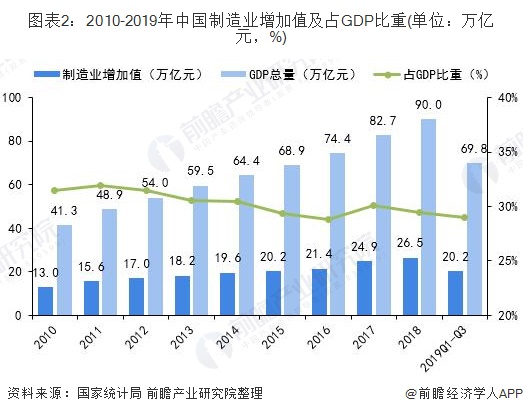 发展至今,我国制造业取得了巨大的成就。根据国家统计局统计数据显示,2018年我国制造业增加值为26.5万亿元,持续占国民生产总值(GDP)30%左右的比重,是名副其实的国民经济支柱产业。