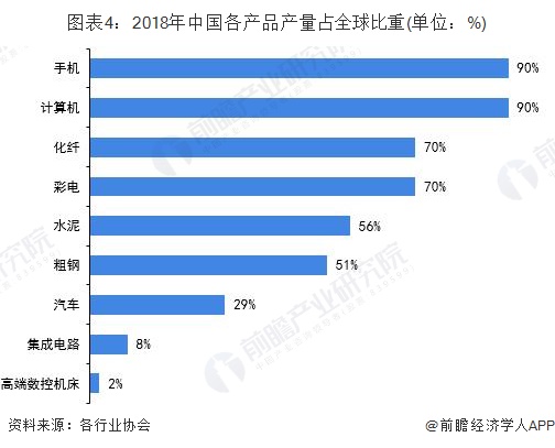 值得注意的是,尽管中国制造业增加值占世界比重在不断加大,但与发达国家相比,制造业发展水平相对较低。目前,中国在钢铁、铜、水泥、化肥、化纤、发电量、造船、汽车、计算机、笔记本电脑、打印机、电视机、空调、洗衣机等数百种制造业产品的产量居世界第一位,但这些产业技术密集度不高,属于中低度技术密集型。在高端芯片、电子制造、消费电子、工业软件、高端数控机床等领域自给率严重不足。