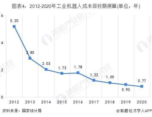 此外,假设一台工业机器人约可以代替4名工人,将维修费、机器折旧费等算入,根据测算,2018年工业机器人成本回收期约为1.05年,到2020年预计下降至0.77年。很明显,在人力成本上升和工业机器人回收期不断缩短的趋势下,工业机器人换人的临界点将至。