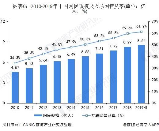 近年来,数字中国建设成效显着,信息基础设施建设加快推进。截至2019年上半年,我国网民规模达8.54亿,较2018年底增长2598万,互联网普及率达61.2%,较2018年底提升1.6个百分点。