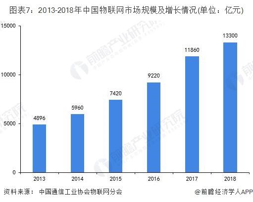 经过业界的共同努力,国内物联网产业链和产业体系初步形成,产业规模快速增长。根据中国通信工业协会物联网分会和MWC的数据显示,2013-2018年中国物联网行业高速增长,从2013年4896亿元增加至2018年的13300亿元,复合增长率高达22.12%。截至2018年底,公众网络M2M连接数达5.4亿个,产值超过10亿元的骨干企业已达120家。