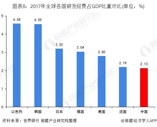 从技术来看,近年来我国研发经费投入强度一直呈稳定上升趋势,与发达国家的差距逐年缩小。根据世界银行数据,2017年我国研发经费占GDP的比重为2.13%,持续追赶法国和美国。