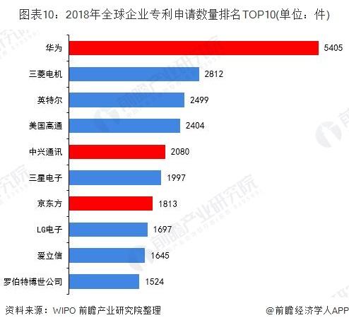 而从企业来看,亦是中国企业领先全球。根据WIPO数据,2018年中国的华为的专利申请量达到5404件,排名全球第一,遥遥领先于排名第二的三菱电机。此外,中兴通讯和京东方均挤进前十。