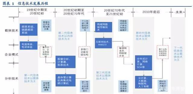 第一代信息技术是首次以电为载体消除通信的空间及时间距离的方式:以纸质信件、电报、电话等信息技术为代表 的第一代信息技术始于十九世纪中期,这一时期“电”作为信息载体被首次引入,通信的空间距离和时间递延被有 效消弭。同时,产业革命后企业的规模、组织层次和管理复杂性不断上升,十九世纪 50 年代开始,工业企业大规模 使用电报通信,有效协调了生产和销售,实现管理和生产的地理分离,这种系统化的企业管理思维在此后的五十年 中逐步形成,企业对生产销售信息的需求及处理量级开始上升。该阶段的数据信息主要以纸质的文字方式记录。