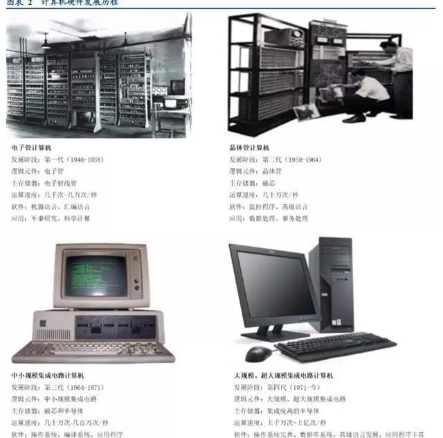 1946-1958 年,电子管计算机:这一时期的计算机硬件采用电子管结构,存储器采用汞延迟线、阴极射线示波管 静电存储器、磁鼓、磁芯,外存储器采用磁带,软件程序主要为机器语言、汇编语言。初代计算机体积大、功 耗高、价格昂贵,其主要用于军事领域和科学计算。