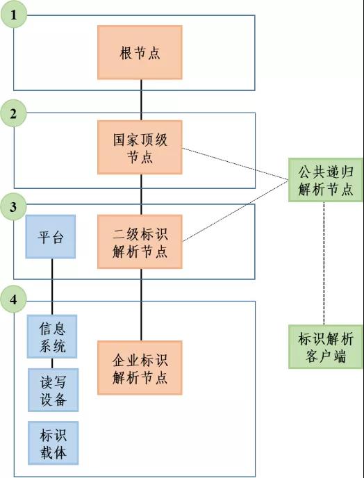 跟DNS架构类似,我国工业互联网标识解析体系由国际根节点、国家顶级节点、二级节点、 企业节点、递归节点等要素组成。