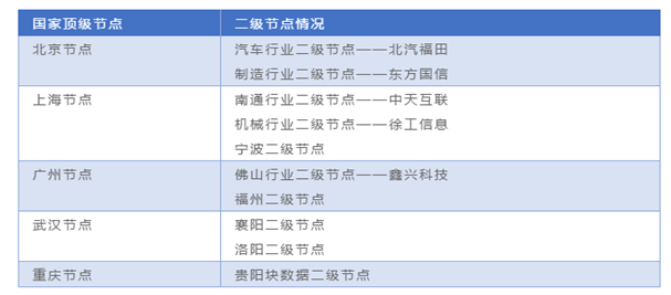截至2019年7月31日,全国已经完成了17个二级节点部署,重点面向汽车制造、装备制造、船舶制造、工程机械、家电制造等不同行业提供标识编码注册、解析、业务管理、应用对接服务。一大批企业积极推进企业应用,三大基础电信企业也在加快探索公共递归节点建设。此外,全国范围内部署中的二级节点有11个,拟建设二级节点的单位有45家;拟签约二级节点单位有7家。