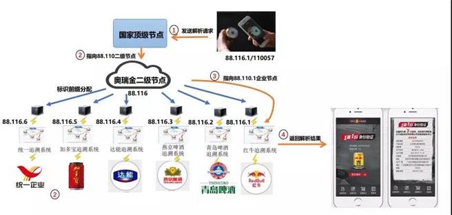 奥瑞金为食品饮料做罐装包装,奥瑞金科技牵头建设的二级节点主要面向食品饮料工业。奥瑞金二级节点为企业用户分配标识前缀。用户通过识读产品上的二维码,向工业互联网标识解析体系发送解析请求,通过国家顶级节点、二级节点、企业节点,解析出产品的追溯信息及营销信息,并将解析结果返回查询终端。通过产品溯源,进一步可以帮助企业实现消费者画像,进而提供精准营销等服务。
