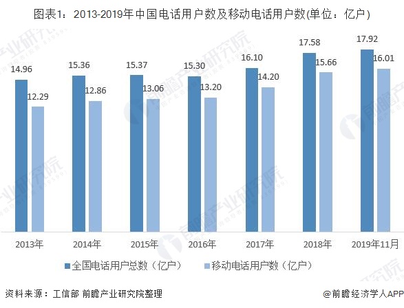 我国移动电话用户数量庞大。从工信部发布的数据来看,2013-2018年中国电话用户数和移动电话用户数总体呈增加趋势变动,其中移动电话用户数增加量明显。2018年,全国电话用户净增1.48亿户,总数达到17.58亿户,比2017年增长9.19%。其中,移动电话用户净增1.46亿户,总数达15.66亿户。