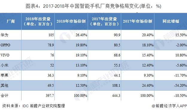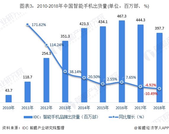 但随着中国智能手机市场的日趋饱和,消费者对新设备的需求放缓,从IDC公布的中国智能手机出货量的数据来看,2017年全年中国智能手机出货量为4.44亿部,较2016年的4.67亿部下滑4.9%,这也是中国智能手机出货量首次出现负增长。2018年,中国智能手机出货量继续下降,降至3.98亿部,较2017年同期下降10.49%,下降幅度进一步加大。