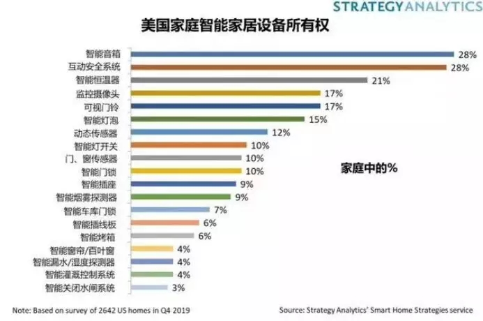 根据Strategy Analytics在2019年第四季度对2642的美国受访者进行调查后发现,智能音箱是所有智能家居产品中最受欢迎的,约4个家庭就有一台智能音箱。