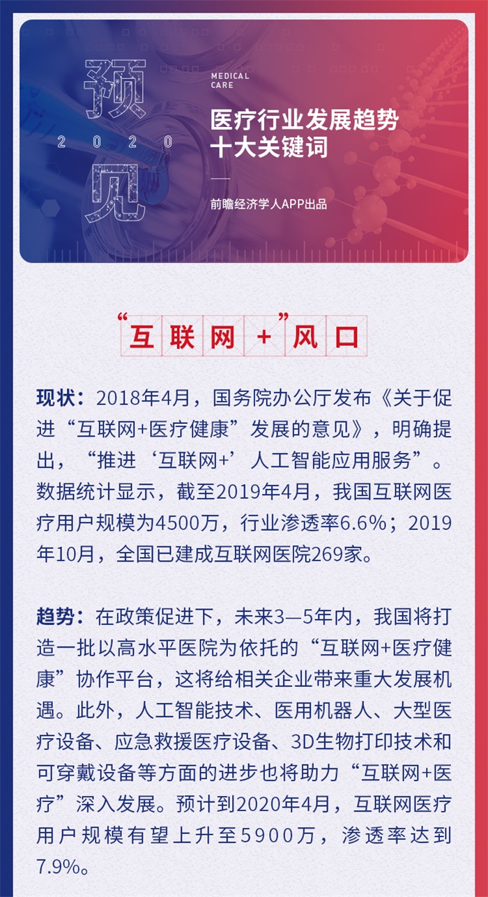 2019年,是新中国成立70周年,也是医疗行业变革、调整与升级的关键一年。这一年,医保支付制度改革、分级诊疗、社会办医、国家药品集采等政策持续推进;以仿制药为主的中国医药工业发展主线逐渐向创新药转化;互联网医疗也在技术的推进下持续向好。但同时,年底发生的医患纠纷悲剧,让原本就紧张的医患关系再次引起社会关注。2019年已经过去,2020年医疗行业又将迎来哪些新变化?跟着前瞻经济学人一起看看吧!