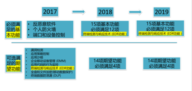 EDR在2016~2019年连续进入 Gartner 的 10 大技术之列,并且预判认为EPP与EDR技术融合会将成为总体趋势,这带动了EPP技术的重大转变。其中,从2018年开始,Gartner规定了15项基本功能必须满足其中的12项才可以入围,最大的变化是把过去众多本属于期望功能的EDR放入了必须满足的基本功能中。