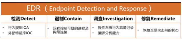 Gartner对于EDR治理高级威胁给出了四项基本定义:检测、遏制、调查和修复能力,这为各大网安企业的EDR产品提供了参考。