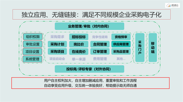解决之路在于对底层架构、技术路径、产品形态以及运行方式,进行高度统筹的“顶层设计”。首先,企业(包括招标代理机构)可以按照“适用即可”的原则选用应用模块,无需过多过度的功能配置,采用“积木式”构建方式,保留了随时添加功能模块的便捷,而相匹配的运营模式保证了系统能够与时俱进,应对业务形态的发展变化随时进行更新迭代,及时满足供应链运行和管理的新需求。