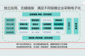 当市场竞争日益演变为企业供应链体系之间的竞争,对企业的供应链管理提出了更高更为急迫的要求,企业信息化在供应链管理中的地位因此与日俱增,而新一代的互联网技术为供应链数字化转型提供了极为重要的支撑。通过对底层架构、技术路径、产品形态以及运行方式,进行高度统筹的“顶层设计”,实现供应链的高效运行和持续优化,成为构建企业核心竞争力的重要组成部分。首先,企业(包括招标代理机构)可以按照“适用即可”的原则选用应用模块,无需过度的功能配置。随着业务发展或是工作流程、管理机制的变化,可通过添加模块、升级迭代、利用工作流配置工具等进行所需的调整。其次,可以按需对各个应用及时升级迭代,用户无需费神。企业对供应链数字化转型的认识和愿望正变得日益强烈,本文希望提供一条投入少、上线快的数字化建设捷径,满足企业对供应链运行和管理的新需求。