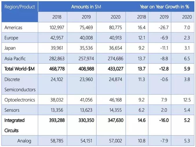 根据世界半导体贸易统计组织(WSTS)发布的最新预测数据显示,2019年全球半导体市场销售额预计将下降12.8%至4090亿美元,创十年来最大跌幅,其中芯片内存首当其冲下降33%,其次是模拟(-7.9%)和逻辑(-4.3%)。预计到2020年和2021年,全球销售额将分别增长5.9%和6.3%。