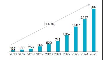 图4:2016-2025人工智能市场规模(单位:十亿美元)