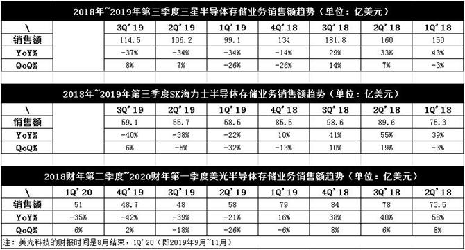图:2018~2019年三星、美光和SK海力士销售额趋势。(来源:电子发烧友)