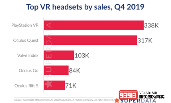 谈到主机游戏,在2月索尼PS+会员(索尼PlayStation主机的付费会员服务)的免费游戏列表中,我看到了一款PSVR游戏《Firewall: Zero Hour》。在我印象中,这好像是PS+会员首次免费赠送的PSVR游戏,这从一个侧面也反映出PSVR相对于PS4主机的重要性正在不断提升。同样来自SuperData的数据,PSVR在2019年第四季度的销量达到了33.8万,继续在VR头显销量上保持领跑地位(Oculus Quest位居第二)。