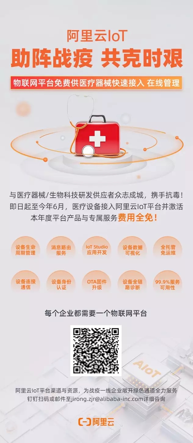 2月3日开工第一天,阿里云就对外宣布,面向医疗器械、生物检测类的AIoT设备,阿里云物联网平台将会提供全年免费平台产品与专属服务。这是继AI能力后,阿里云对防疫开放的另一个能力。