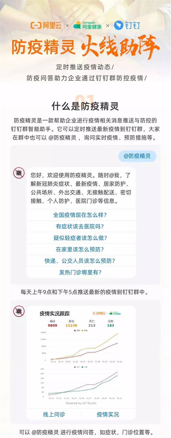 另外,肺炎疫情已经成为今年春节关注度最高的话题且没有之一。而一旦关注度高却又缺少科学传播渠道,很容易为谣言的传播滋生土壤。为此,阿里云联合钉钉、阿里健康一道,紧急上线“防疫精灵”群机器人。防疫精灵是一款能够帮助企业进行疫情相关消息推送与防控的钉钉群智能助手。它可以定时推送最新疫情到钉钉群,用户也可以在群中@防疫精灵询问实时疫情、预防措施等。