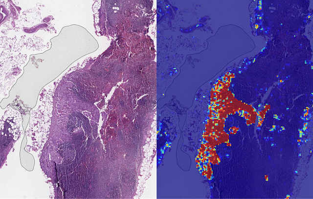左侧:包含淋巴结的载波片有多个组学伪影 右侧:LYNA 识别肿瘤区域在中央(呈红色),并正确地将周围充满伪影的区域分类为非肿瘤区域(呈蓝色)