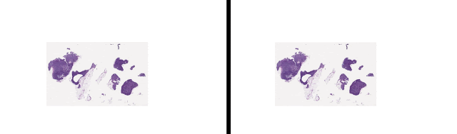 左侧:含有微转移淋巴结的载波片的放大图 右侧:相同视图,在 LYNA 辅助后用蓝色标注出肿瘤的位置