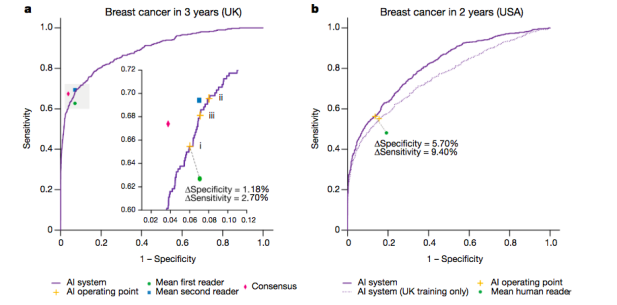 可喜的是,2020 年伊始,Google 又在癌症诊断方面带来了好消息。1 月 1 日,Google Health 部门联手 DeepMind 在 Nature 学术期刊上发布乳腺癌人工智能检测系统。该模型是在一个具有代表性数据集上进行训练和调整的,数据集由 76000 多名英国女性和 15000 多名美国女性的未经识别的乳腺 X 线影像组成。然后在一个单独的未经识别的数据集上进行了评估(包括 25000 多名英国女性和 3000 多名美国女性)。评估结果显示,对比放射科医生,AI 模型的假阳性低了 5.7%(美国)和 1.2%(英国),假阴性低了 9.4%(美国)和 2.7%(英国)。另一项研究中,该系统的表现超越了六位放射科专家。