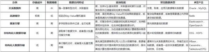 对于数据存储组件我们再进一步分析,当前各类数据存储组件的设计是为满足不同场景下数据存储的需求,提供不同的数据模型抽象,以及面向在线和离线的不同的优化偏向。我们来看下下面这张详细对比表: