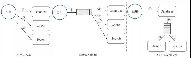 CDC(Change Data Capture)技术:这种架构下数据写入主存储后会由主存储再向辅存储进行同步,对应用层是最友好的,只需要与主存储打交道。主存储到辅存储的数据同步,则可以再利用异步队列复制技术来做。不过这种方案对主存储的能力有很高的要求,必须要求主存储能支持CDC技术。一个典型的例子就是MySQL+Elasticsearch的组合架构,Elasticsearch的数据通过MySQL的binlog来同步,binlog就是MySQL的CDC技术。
