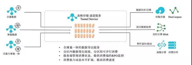 通道服务是Tablestore的CDC技术,是支撑数据派生体系的核心功能,具体能力可参考这篇文章。能够被利用在异构存储间的数据同步、事件驱动编程、表增量数据实时订阅以及流计算场景。目前在云上Tablestore与Blink能无缝对接,也是唯一一个能直接作为Blink的stream source的结构化大数据存储。
