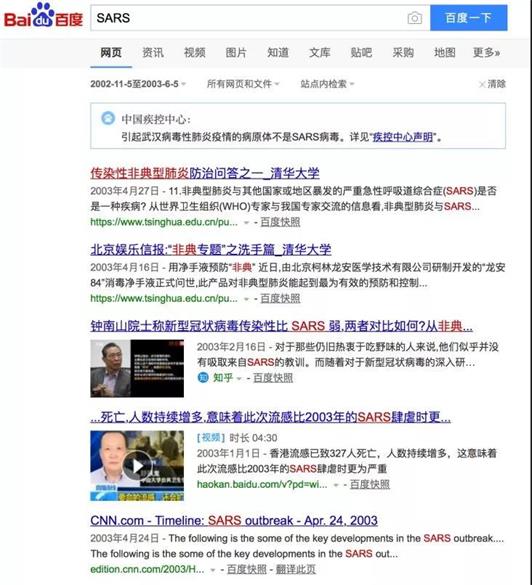 时间调到2002年11月至2003年6月,百度搜索SARS病毒你可以看到信息某某公司研发的“84”洗手液正式问世、新开发的预警系统,可以用来研究非典病毒在不同天气状况下的扩散及演变规律。