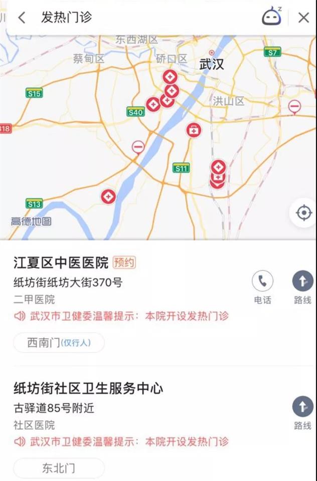 例如,居民如有因发热需要就诊,可用高德地图搜索 " 发热门诊 " 或 " 新型冠状病毒定点医院 ",查询附近相关机构,就近就医,避免出现交叉感染。