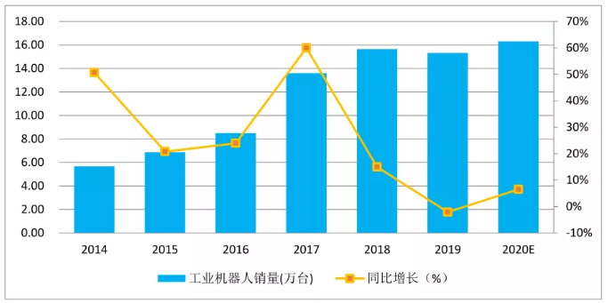 GGII数据显示,2019年中国工业机器人销量15.31万台,同比下滑2.11%。