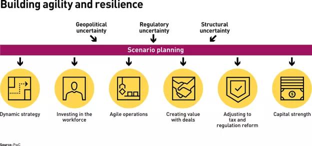 在不确定性中取得成功所需的相互关联和相互加强的属性是明确的。无论主题是战略还是劳动力、运营还是交易、税收和监管还是金融,同样的信息也适用。组织必须对行动有偏见。作为基准,企业必须努力适应增长,将成本与优先事项和战略相结合,投资于差异化能力,并使用传统和数字杠杆来执行。他们必须不断参与情景规划、构建和评估一系列选项,以提供更广阔的视野和成功的可能性,而不是设定单一的固定路线。他们必须建立敏捷的能力——拥有平衡和能力,使他们能够转移重点、优先事项和资源,以适应不断变化的环境。它们必须进化为更具弹性——能够承受强大的外部力量,迅速从挫折中恢复,并保持从新机遇中受益的地位(见“建立灵活性和弹性”)。