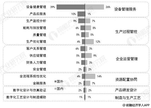 从具体平台应用来看,我国工业互联网平台主要应用于生产过程管控、资源配置协同、设备管理服务,而国外则主要用于设备管理服务,占比高达49%,这主要是由于国外工业数字化水平较高,对工业数据分析较深入。国内应用占比最高的是生产过程管控,为32%,主要是由于我国应用市场需求高、普及率低,带来较多产线上云的应用实践。